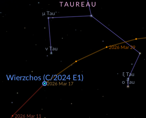 mardi 17: La comète C/2024 E1 Wierzchos passe au plus près de la Terre à 1,3 UA (200 millions de km) Elle sera visible au-dessus de l’horizon Sud à partir du 28 février quand elle sera à 15° de l’horizon