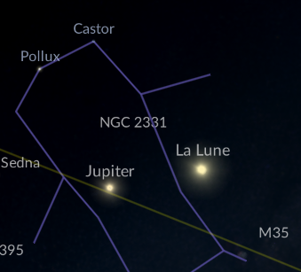vendredi 27 : par rapport à la veille, la Lune a basculé à l’Est de Jupiter du fait de son mouvement propre autour de la Terre